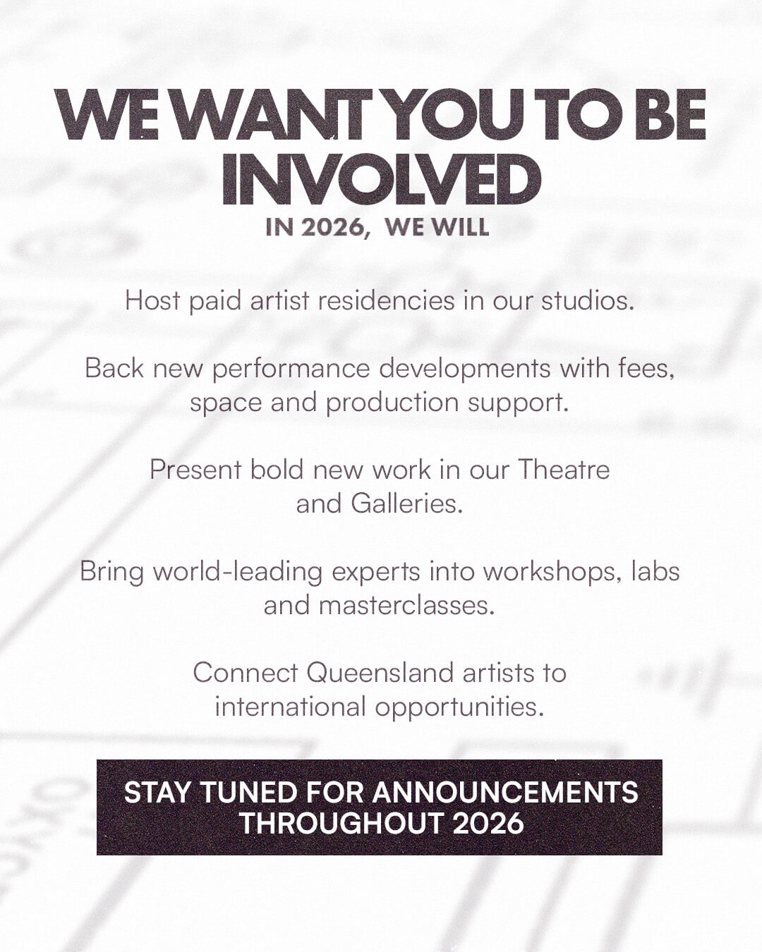 Stay tuned on our social media and e-news to find out all about our events, new approaches and artist support through the first half of 2026, and watch as we launch a wave of new projects, collaborations and bold new art – we’re excited about what’s ahead and look forward to keeping you in the loop about how we’re growing, changing, and rewiring for the future.